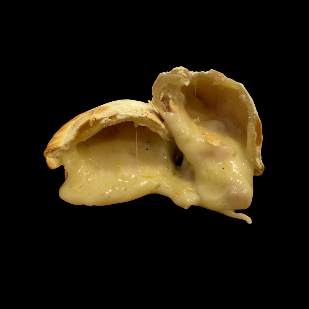 Empanada rellena de jamón york, mozzarella derretida, puré de patatas y bechamel. Crujiente por fuera, tierna por dentro. ¡Un clásico que explota en sabor en cada mordisco!